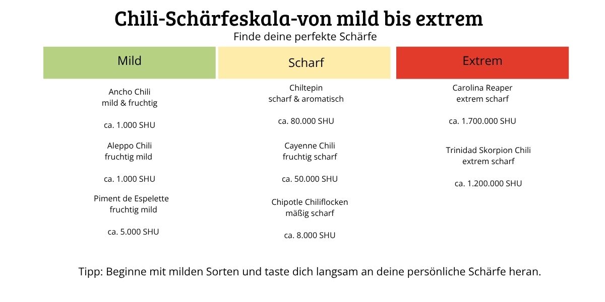 Die Schärfe von Chili lässt sich gut steuern – beginne mit kleinen Mengen und taste dich langsam an dein persönliches Niveau heran. Besonders scharfe Sorten sollten immer vorsichtig dosiert werden.
