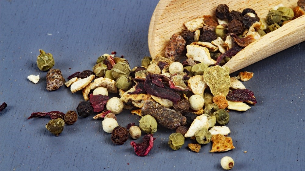 Zutaten: weißen und schwarzen Pfeffer, Grünen Urwaldpfeffer, Szechuanpfeffer, Langen Pfeffer sowie Urzitronenschalen, Maychangpfeffer und Hibiskusblüten.