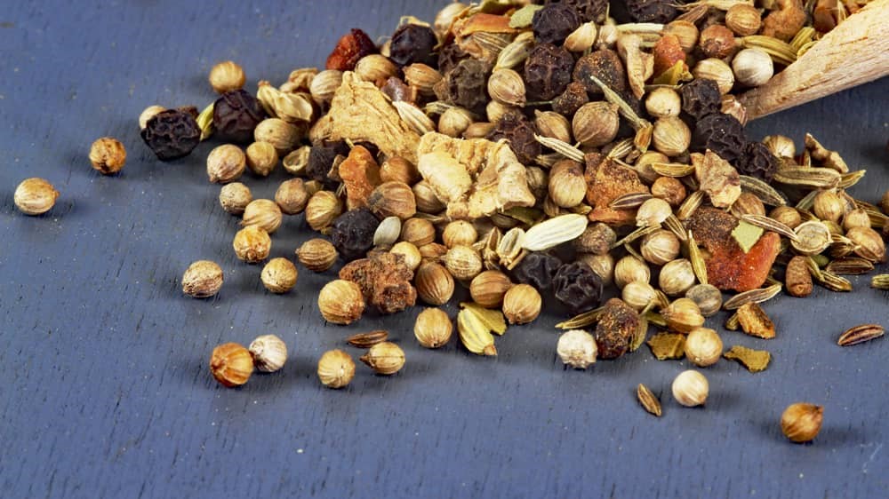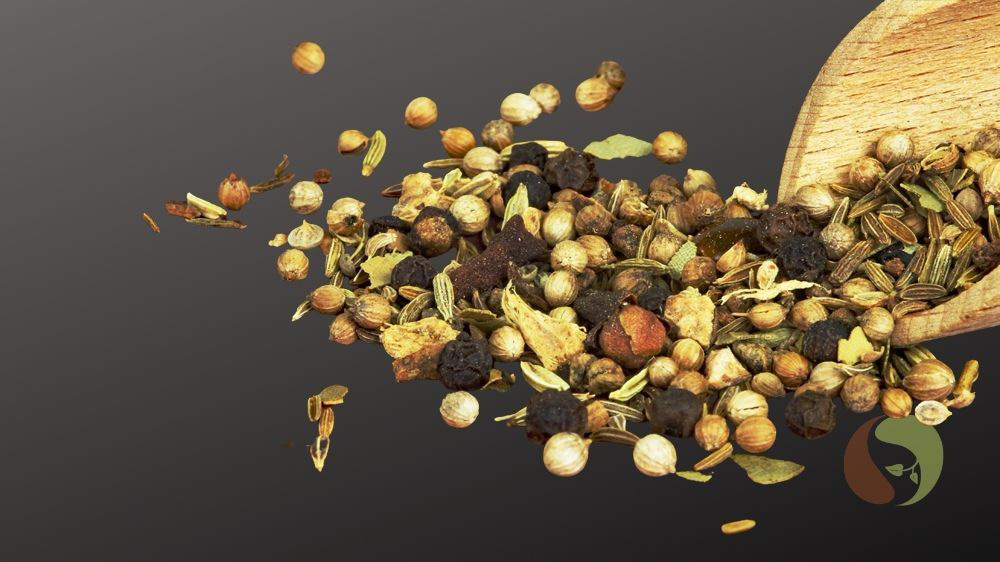 Zutaten: Koriandersamen, Cumin, Tigerpfeffer, Kardamomsamen, Ingwer, Anis, Fenchel, Gewürznelken, Lorbeerblättern, Ceylon Zimt und Muskatnuss