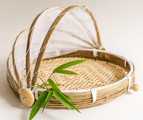 Das 30 cm große, handgefertigte Tablett aus robustem Bambus bietet ausreichend Platz für Kuchen, Obst und Snacks. Die charmante Abdeckhaube aus Bambusstreben und Polyester-Insektengitter schützt deine Speisen zuverlässig vor lästigen Insekten, ohne die Optik zu beeinträchtigen. Jedes Tablett ist ein Unikat aus traditioneller Handarbeit im Mekongdelta, nachhaltig produziert und fair gehandelt. Ob beim Picknick oder auf der Terrasse – dieses stilvolle Tablett verbindet Funktionalität mit natürlicher Eleganz und unterstützt gleichzeitig Kleinbauern und Umwelt.