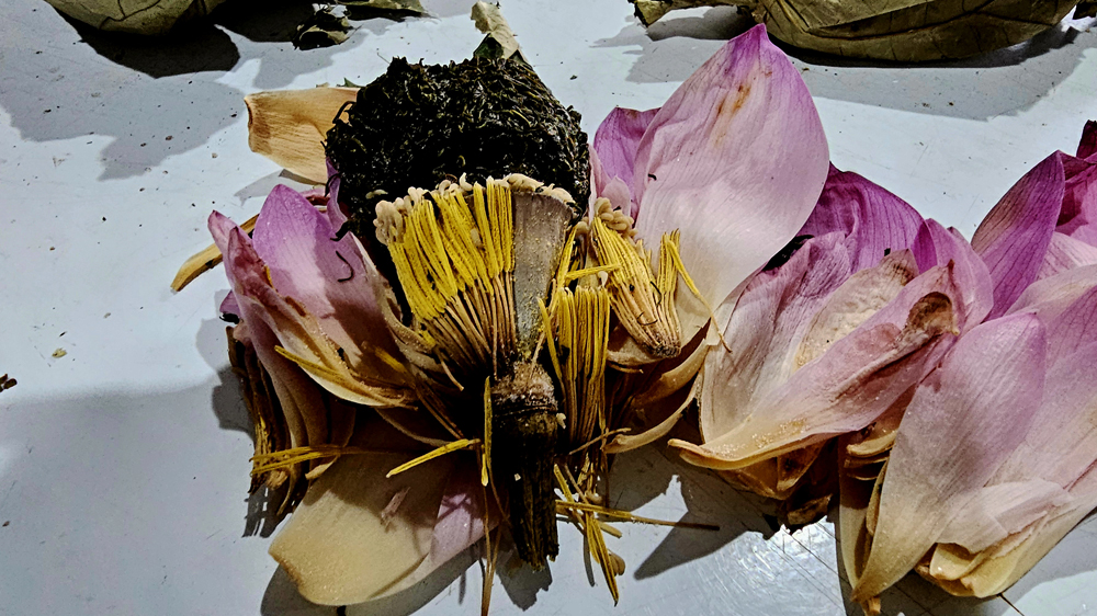 4) Highlight: Gefriergetrocknete ganze Lotosblüte, gefüllt mit jungem Grüntee