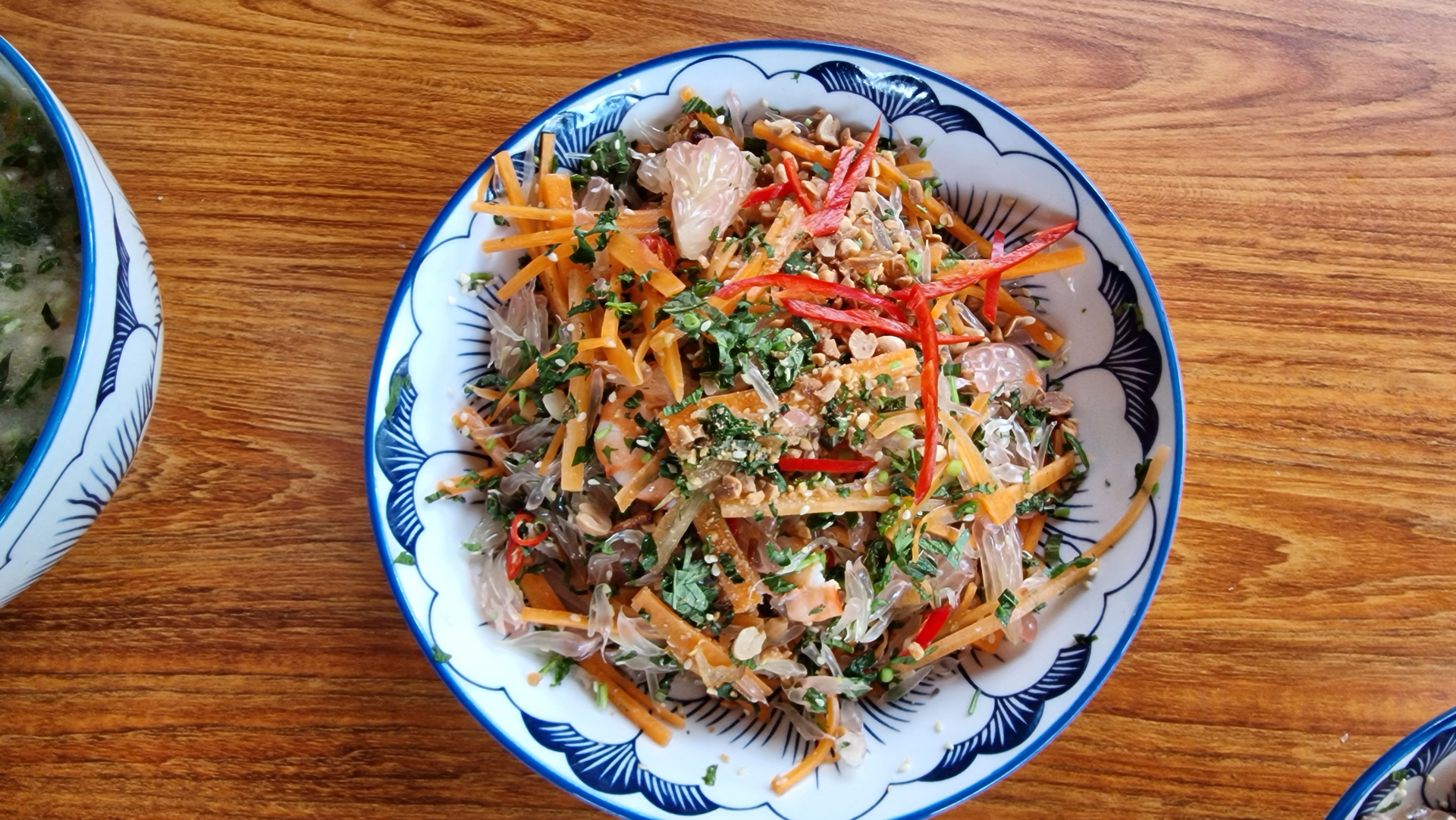 5. Servieren und Genießen: Kurz vor dem Servieren den Salat noch einmal gut durchmischen. Richte den Salat auf Tellern an und streue die grob gehackten gerösteten Erdnüsse oder Cashewkerne darüber. Sie sorgen für einen herrlichen Kontrast in Textur und Geschmack. Dieser erfrischende Salat ist die perfekte leichte Vorspeise an warmen Tagen oder eine belebende und magenfreundliche Zwischenmahlzeit. Lass dich von den Aromen Phu Quocs verzaubern und genieße ein Gericht, das Körper und Seele gleichermaßen guttut!