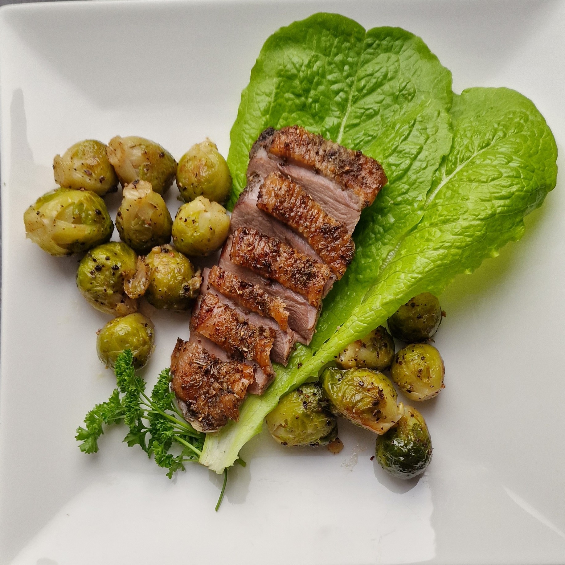 Ist die gewünschte Kerntemperatur erreicht, die Gänsebrust kurz ruhen lassen, in Scheiben schneiden und zusammen mit Maronen und Rosenkohl servieren.