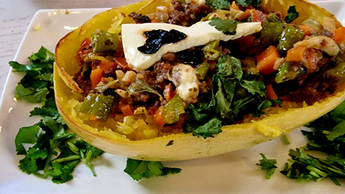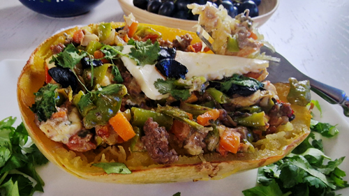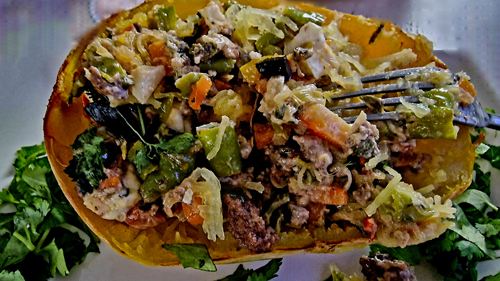 Spaghettikürbis mediterran mit Hackfleisch und Schafskäse
